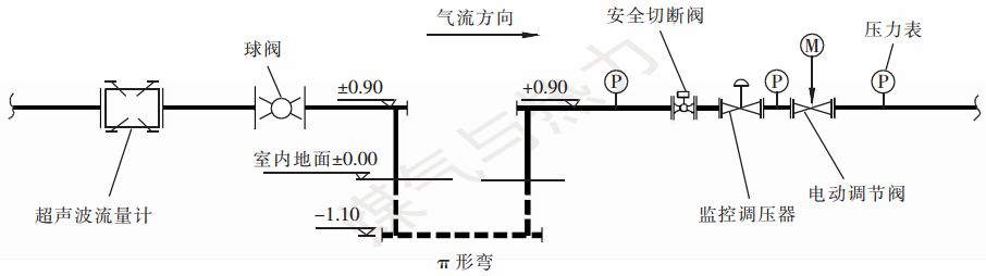 對(duì)于電動(dòng)調(diào)節(jié)閥與超聲波流量計(jì)串聯(lián)設(shè)置對(duì)后者的干擾問題,結(jié)合國(guó)內(nèi)外先進(jìn)經(jīng)驗(yàn)和作者團(tuán)隊(duì)的深入研究,本站采用π形彎的方式進(jìn)行降噪,即利用4個(gè)三通拼接成一個(gè)π形[3]。在不同的方案中,可根據(jù)現(xiàn)場(chǎng)條件、場(chǎng)地大小形狀及檢修通道的布置來考慮π形彎是以平行還是垂直于地面的方式布置。π形彎布置[3]見圖1。
