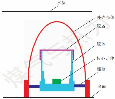 如圖2所示,防水透氣殼的外殼殼體采用橢球狀設(shè)計(jì),腔體高度大于外殼殼體高度的1/2。當(dāng)水位沒過裝置底面達(dá)10 m時,防水透氣殼內(nèi)部氣體體積大約被壓縮到原體積的1/2,裝置的外殼殼體采用半橢球形設(shè)計(jì),因此,此時外殼殼體內(nèi)水面在外殼殼體高度的1/2位置以下。本裝置腔體的設(shè)計(jì)高度大于外殼殼體高度的1/2,因此,防水透氣殼內(nèi)的水面位置在腔蓋以下,可以防止液態(tài)水進(jìn)入腔體內(nèi)??梢?,即使在水位沒過裝置底面達(dá)10 m的惡劣條件下,該裝置仍能夠?qū)η惑w內(nèi)的核心元件起到很好的保護(hù)作用。