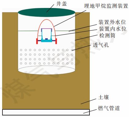 將埋地甲烷監(jiān)測裝置安裝在一個具有承壓及透氣功能的檢測筒內(nèi),檢測筒下方敞口,并與土壤接觸,內(nèi)部無土壤,檢測筒四周打孔,上方設(shè)置井蓋,井蓋與甲烷監(jiān)測裝置采用剛性連接,使得甲烷監(jiān)測裝置固定于檢測筒內(nèi),工作人員可以隨時對檢測筒內(nèi)的甲烷監(jiān)測裝置的傳感器及電池進(jìn)行校準(zhǔn)及更換。檢測筒安裝在管道正上方。參考目前的燃?xì)夤艿佬孤c(diǎn)定位打孔深度為0.5 m,因此,燃?xì)鈾z測筒的通常高度為0.5 m,可根據(jù)管道埋深增加檢測筒高度。甲烷監(jiān)測裝置及檢測筒的布置見圖1。