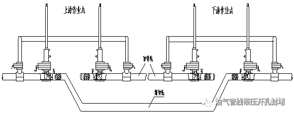 本次改造施工采用四封四堵不停輸封堵工藝,該種工藝優(yōu)點(diǎn)在于:所有工序均在不影響管線內(nèi)介質(zhì)正常輸送的狀態(tài)下進(jìn)行且減少了長(zhǎng)距離鋪設(shè)旁通管線的工作量,縮短了施工周期,使工作進(jìn)行的井然有序,安全可靠。