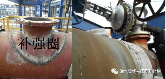 以上兩種施工工藝,根據(jù)主管線的設(shè)計(jì)壓力等級(jí)、開孔口徑是否>D/2(D為管道的公稱直徑)可選擇全包開孔管件和非全包管件;當(dāng)管線設(shè)計(jì)壓力等級(jí)不超2.5Mpa時(shí),開孔口徑>D/2時(shí),也可選用較為經(jīng)濟(jì)的補(bǔ)強(qiáng)圈措施對(duì)母管線進(jìn)行補(bǔ)強(qiáng)處理。