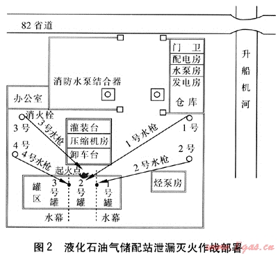 ② 消防作業(yè)組人員立即啟動消防水系統(tǒng),對所有儲罐進(jìn)行持續(xù)冷卻,同時用大量的噴霧水流驅(qū)散站內(nèi)的液化石油氣蒸氣云。