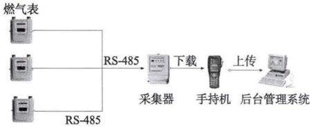 有線抄表系統(tǒng)主要由燃?xì)獗?、采集器和手持機(jī)構(gòu)成,其原理如圖2所示。燃?xì)獗硗ㄟ^(guò)通信總線與采集器相連,采集器定期采集燃?xì)獗頂?shù)據(jù)并存儲(chǔ)于芯片中。工作人員通過(guò)手持機(jī)讀取采集器中所存儲(chǔ)的燃?xì)獗頂?shù)據(jù)并將其上傳到燃?xì)馄髽I(yè)后臺(tái)管理系統(tǒng)。