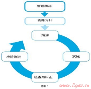 用能企業(yè)是實現(xiàn)能源節(jié)約的核心。在以節(jié)能減排為重要目標(biāo)的指引下,企業(yè)使用任何能源,都應(yīng)制定一個基本的控制程序,形成一個有效能源管理體系運行模式。企業(yè)為兌現(xiàn)管理承諾和實現(xiàn)能源方針應(yīng)進(jìn)行策劃-實施-檢查與糾正-持續(xù)改進(jìn)(PDCA)等過程。圖示如下(圖表1):