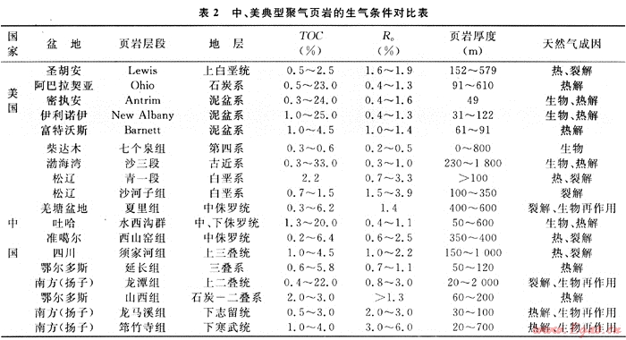 中國與美國在頁巖氣富集條件上具有許多相似之處,美國頁巖氣大規(guī)模的成功開發(fā)為中國的頁巖氣勘探研究提供了參考模式。在美國,圍繞加拿大地盾南緣形成了廣泛的古生界海相沉積,后期的改造和演化形成了現(xiàn)今呈弧形展布的一系列盆地;在中國,塔里木、華北和揚(yáng)子地臺及其周緣廣泛發(fā)育了不同地質(zhì)時代的多套黑色頁巖,其頁巖氣形成條件完全可與北美相媲美(表2)。以美國東部與中國南方為例,兩者分別在頁巖發(fā)育時代、地層沉積格局、有機(jī)質(zhì)熱演化程度、后期構(gòu)造演化、破壞程度與保存條件、頁巖含氣性以及頁巖氣聚集模式等方面具有可比之處。從兩者系統(tǒng)對比的結(jié)果可以看出,中國頁巖氣形成的地質(zhì)條件優(yōu)越。