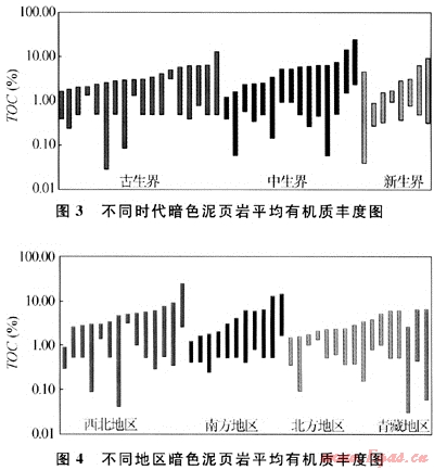 古生界、中生界分布范圍較廣并大致以天山為中心形成南、北“蹺蹺板”式沉積特點,即早古生代時以天山以南的塔里木地塊為沉降沉積中心,形成較大面積分布的海相頁巖。晚古生代時則以天山以北的準(zhǔn)噶爾地塊為中心形成頁巖沉積。晚二疊紀(jì)末中生代以來,全區(qū)進(jìn)入陸相沉積環(huán)境,“蹺蹺板”運(yùn)動基本結(jié)束,總體上表現(xiàn)出總有機(jī)碳含量向上逐漸增加的趨勢。