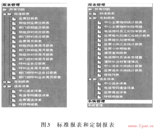 與服務熱線數(shù)字化管理的基本應用工具比較,報表反映的內容更全面更系統(tǒng)。尤其體現(xiàn)在熱線定制報表上。它把企業(yè)多年來在傳統(tǒng)數(shù)據(jù)統(tǒng)計匯總報表上積累的經(jīng)驗作了優(yōu)化組合和集中提煉,針對性和效果都很好。圖3截取了報表管理系統(tǒng)中有關報表分類的樹狀結構分布。