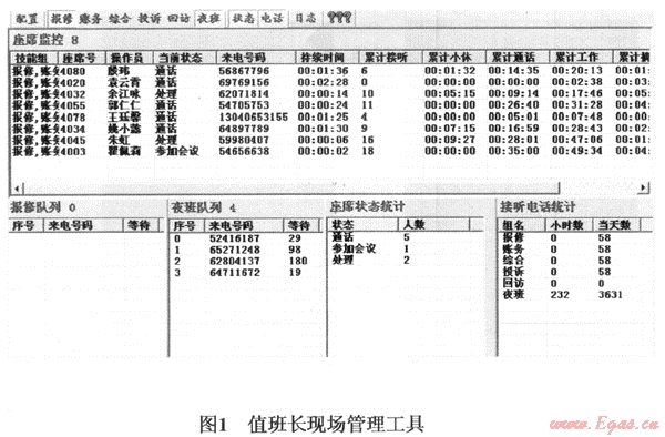 請注意,此處“當前狀態(tài)”顯示的信息正是本文前述“工作狀態(tài)量化考核”中提及的基本內容。如果“狀態(tài)”時間超標,對應的“持續(xù)時間”一列數(shù)據(jù)顯示就會變成紅色,提示值班長應予重點關注,必要時進行適當干預,確保服務熱線現(xiàn)場工作有序進行。管理工具的下半部顯示出各技能分組隊列放置情況、當前話務統(tǒng)計數(shù)據(jù)及坐席人員配置現(xiàn)狀。一旦有情況,當班值班長可以根據(jù)隊列狀態(tài)及時調整相關技能組的人員配置。