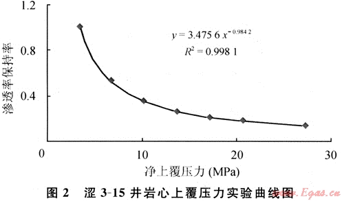 滲透率下降幅度較大,除與該類巖性疏松有關(guān)外,還與巖石的孔隙結(jié)構(gòu)和泥質(zhì)含量有關(guān),對一些泥質(zhì)含量高、以晶間孔為主和微裂縫發(fā)育的巖樣,其滲透率隨上覆壓力下降的程度要比以粒間孔為主的粉砂巖更大,其關(guān)系式為: