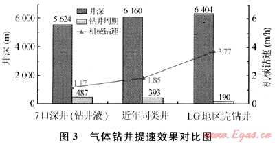 近兩年在15個構(gòu)造上累計實施氣體鉆井技術(shù)提速69口井、131井次,平均機(jī)械鉆速為12.73m/h,平均機(jī)械鉆速提高2~14倍。LG地區(qū)陸續(xù)開展44口井96井次的氣體鉆井作業(yè),總進(jìn)尺為122318m,占LG地區(qū)鉆井總進(jìn)尺的48.96%。LG地區(qū)已完鉆的25口井平均井深為6404m,平均鉆井周期為190d,氣體鉆井平均進(jìn)尺比例為46.3%,完鉆井平均機(jī)械鉆速為3.77m/h,平均月速度為1012m/臺月。氣體鉆井技術(shù)的應(yīng)用使超深井鉆井能力得到極大提升,超深井鉆井速度實現(xiàn)重大突破,與近年同類井(6000m以上氣體鉆超深井七北101、黃金1、東升1等井)及近年常規(guī)鉆井液鉆超深井相比,技術(shù)指標(biāo)大幅提高(圖3)。