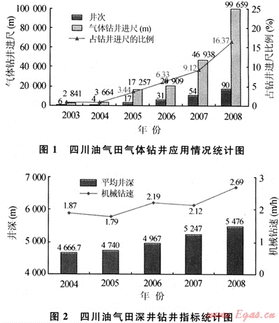 四川油氣田巖石可鉆性差,鉆井速度慢,“十五”期間平均機(jī)械鉆速為2.35m/h,深井、超深井平均機(jī)械鉆速為1.87m/h;此外,井漏頻繁、惡性井漏時有發(fā)生,2005年川渝地區(qū)井漏各種材料89992m3,因堵漏損失鉆井周期15.1臺月,井漏占復(fù)雜時率的60%;再就是低孔、低滲、低壓及水敏性油氣藏,鉆井過程中鉆井液往往造成儲層不可逆轉(zhuǎn)的傷害,造成油氣資源及勘探開發(fā)成本浪費,也嚴(yán)重地制約了勘探開發(fā)的進(jìn)程[1]。針對以上難點,研究并試驗了氣體鉆井技術(shù),該技術(shù)已成為解決井漏、及時發(fā)現(xiàn)和保護(hù)油氣層及大幅度提高機(jī)械鉆速的關(guān)鍵技術(shù)。目前,四川油氣田氣體鉆井技術(shù)的應(yīng)用規(guī)模逐漸加大,氣體鉆井進(jìn)尺比例逐年增加(圖1),深井、超深井整體機(jī)械鉆速大幅度提升(圖2),鉆井周期大幅降低,并形成了一套適合四川油氣田地質(zhì)特點的氣體鉆井系列技術(shù)。