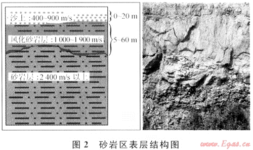 該區(qū)地表巖性復(fù)雜,表層結(jié)構(gòu)縱、橫向變化較大(見(jiàn)圖2)。在堿灘堿湖、沙漠區(qū)用小折射方法,砂巖出露區(qū)用微測(cè)井方法進(jìn)行表層調(diào)查。