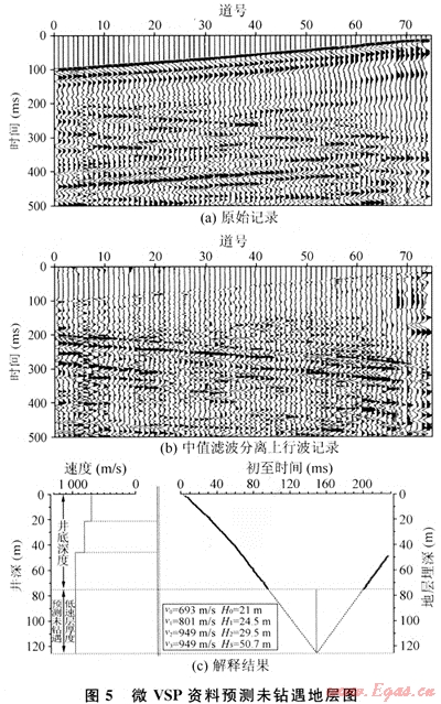 圖5-a是該區(qū)采集的微VSP野外原始記錄,利用中值濾波進(jìn)行波場(chǎng)分離,分離后的上行波記錄如圖5-b所示,該波場(chǎng)分離方法能較好地分離出上行波。圖5-c是該軟件解釋結(jié)果,得到低降速帶深度或高速度層頂界深度為125m,井底至高速層頂50m。