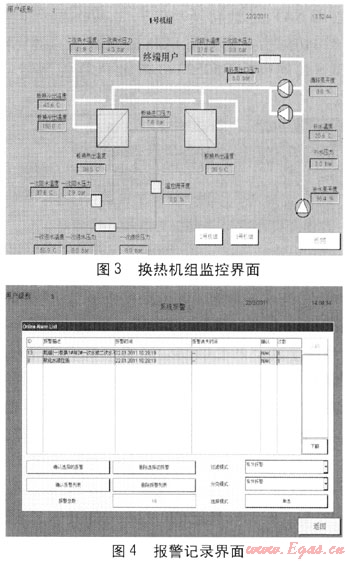 某城市集中供熱工程包括40座熱力站,項目規(guī)劃供熱面積為350×104m2。該項目分兩期建設(shè),一期工程于2009年4月開工建設(shè),已完成11座熱力站的安裝調(diào)試。熱力站控制器采用了具有嵌入式Web服務(wù)器功能的SAIA PCD系列控制器。換熱機(jī)組監(jiān)控界面、報警記錄界面分別見圖3、4。