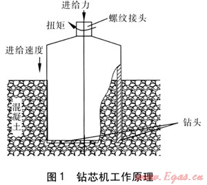 鉆芯機(jī)是以表鑲金剛石切割筒式高性能鉆頭旋轉(zhuǎn)切割鉆進(jìn)的機(jī)械,工作原理見圖1。機(jī)體通過軸的傳遞給切割筒式鉆頭施加一定的壓力和扭矩,鉆頭旋轉(zhuǎn)向下切割路面,使路面出現(xiàn)一個(gè)圓形切割縫和圓柱形芯塊,鉆到底后將芯塊提取出來,便可對(duì)埋在正下方的管道進(jìn)行施工。在鉆進(jìn)過程中,以水作為鉆頭的冷卻液,這些水還可以清洗孔底,具有排屑、潤(rùn)滑鉆頭的作用。