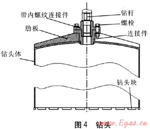 鉆頭為表鑲金剛石切割筒式高性能鉆頭,是鉆芯機(jī)直接切割混凝土芯塊的刀具。切割鉆進(jìn)混凝土的效率、鉆進(jìn)速度及鉆頭壽命,在很大程度上與鉆頭結(jié)構(gòu)形式及材料狀況有關(guān),因此鉆頭設(shè)計(jì)非常重要。從鉆芯機(jī)工作時(shí)的受力情況來看,鉆頭承受著很大的軸向載荷及摩擦力,因此,要求鉆頭體有較高的表面硬度、較好的耐磨性及足夠的剛度,不易發(fā)生變形,按此要求設(shè)計(jì)的鉆頭見圖4,其中,鉆頭塊含金剛石和胎體。