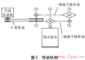 傳動(dòng)機(jī)構(gòu)采用V帶傳動(dòng)和兩級(jí)滾子鏈傳動(dòng),通過多級(jí)減速傳動(dòng)輸出,帶動(dòng)筒式鉆頭旋轉(zhuǎn)切割,傳動(dòng)機(jī)構(gòu)見圖3。