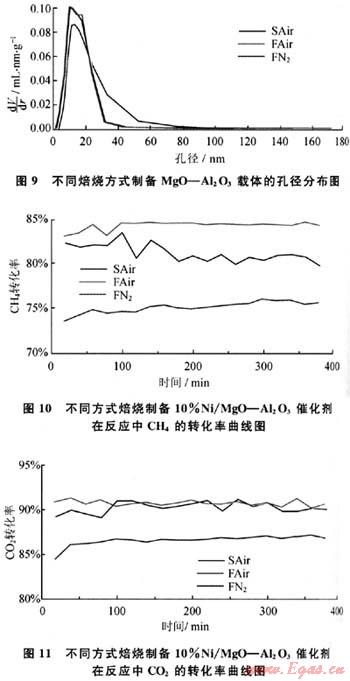 圖10、圖11為不同方式焙燒MgO-Al203載體制備10%Ni/ MgO-Al203催化劑在反應中CH4和CO2的轉化率。從圖10、11中可以看出,流動空氣條件下焙燒載體催化劑的催化活性較好,CH4和CO2的轉化率分別可以達到82%和92%左右,隨著反應的進行,流動空氣焙燒催化劑的催化活性一直較為穩(wěn)定,表明催化劑的穩(wěn)定性較好。
