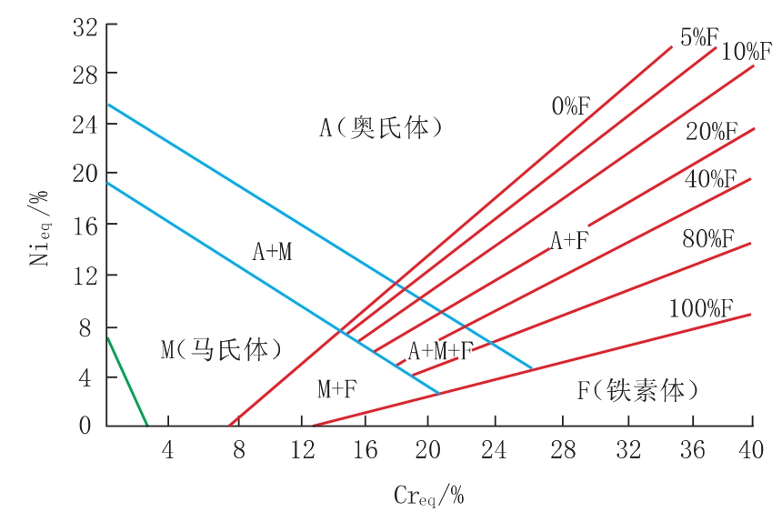 舍夫勒?qǐng)D估算法的具體步驟如下: ①明確焊接所采用的焊接工藝方法、 焊件的坡口形式; ②對(duì)所選焊材的化學(xué)成分及各基體 (即母材) 的化學(xué)成分進(jìn)行統(tǒng)計(jì); ③計(jì)算第一層焊縫 (即打底焊縫) 中的化學(xué)成分。 通常情況下,第一層的稀釋率最大,同時(shí)焊接應(yīng)力也是最大的,只要第一層不產(chǎn)生裂紋,第二層、 第三層一般不會(huì)產(chǎn)生裂紋。 所以我們計(jì)算焊縫金屬的化學(xué)成分時(shí),只要計(jì)算第一層 (即打底層) 即可; ④計(jì)算第一層焊縫 (即打底焊縫) 中的Cr 當(dāng)量和Ni 當(dāng)量; ⑤在Gr-Ni 鋼舍夫勒?qǐng)D中查找計(jì)算出Cr 當(dāng)量和Ni 當(dāng)量所對(duì)應(yīng)的點(diǎn)所處的區(qū)域,若對(duì)應(yīng)的點(diǎn)處于A+F區(qū)域 (鐵素體含量約5%),則說明焊材選擇合適,否則需要重新選擇焊材。