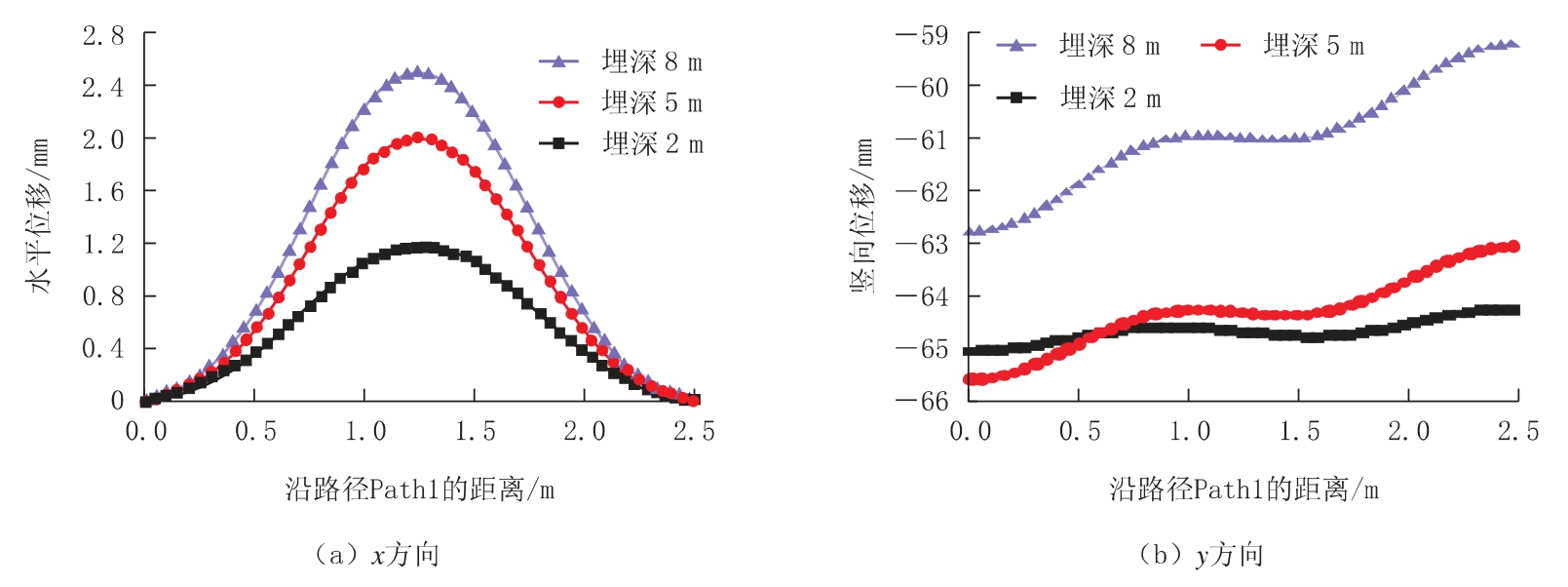 沿著路徑 Path1,埋深為 2 m、 5 m 和 8 m的管體位移曲線如圖9 所示。 由圖9 可見,起始端和末端的水平位移較小,路徑中間部分x 方向的位移較大,埋深為8 m 的整體水平位移變化幅度最大,埋深5 m 的整體水平位移變化幅度次之,埋深為2 m 的管體水平位移變化幅度最小。 y 方向位移起始端位移相對(duì)于末端位移要大,路徑中間部分y 方向位移變化幅度較小,主要是因?yàn)楣荏w中間兩側(cè)受到土體的擠壓作用。