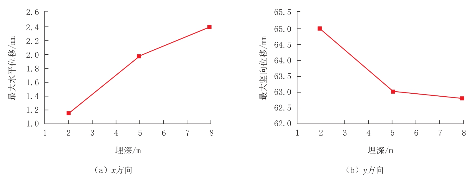 不同埋深下管體的位移分布如圖10 所示。從圖10 可見,不同管體的最大x 方向位移隨著埋深的增加而增大,管體的最大y 方向位移隨著埋深的增加而減小。 這主要是由于埋深越深,土體的重力作用幅度越大,管體節(jié)點(diǎn)在y方向運(yùn)動(dòng)的幅度小的緣故。