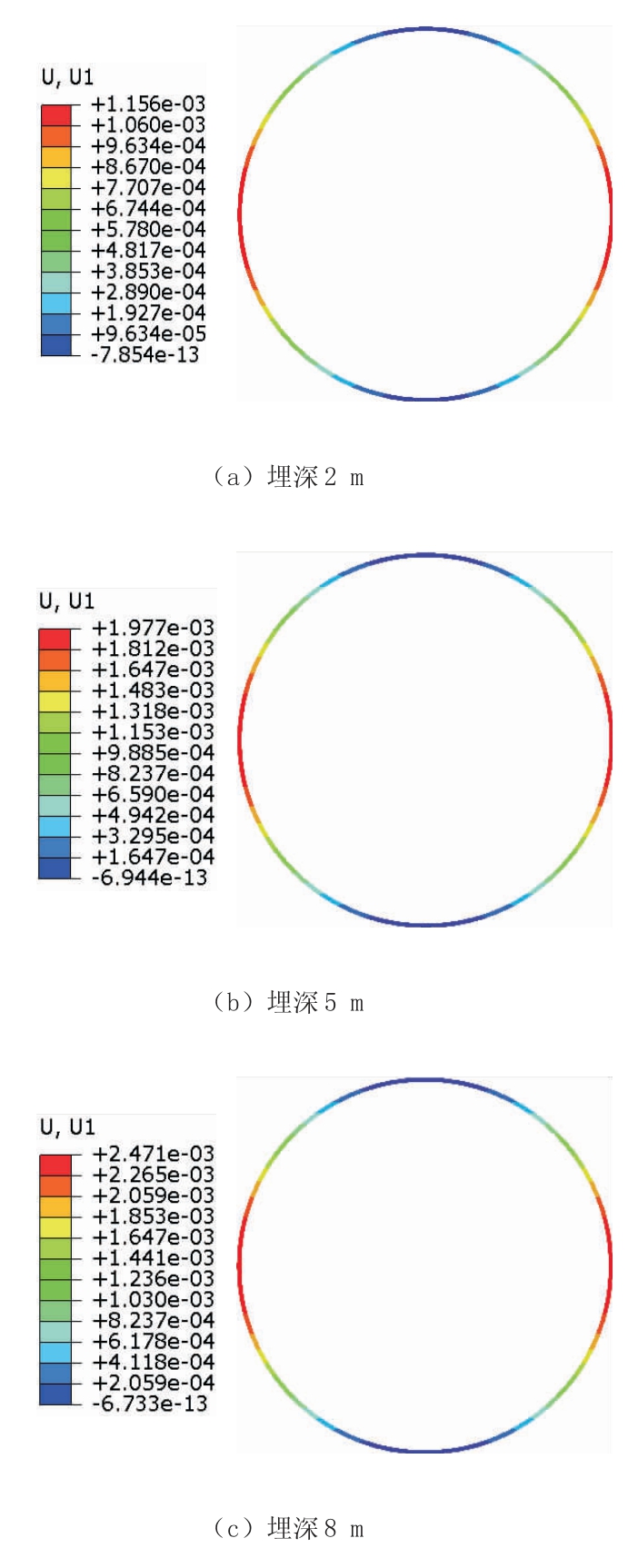 不同埋深下管體x 方向應(yīng)變分布云圖如圖6所示。 從圖6 可見,埋深 2 m、 5 m 和 8 m 時(shí),x 方向的最大位移即最大變形分別為1.16 mm、1.98 mm 和2.47 mm。 隨著埋深的增加,管體受到的徑向位移逐漸增大,徑向變形主要集中在管體左、 右兩側(cè)。 y 方向的位移主要來自土壤自身的變形和鋼管受土體的作用力后發(fā)生的變形。