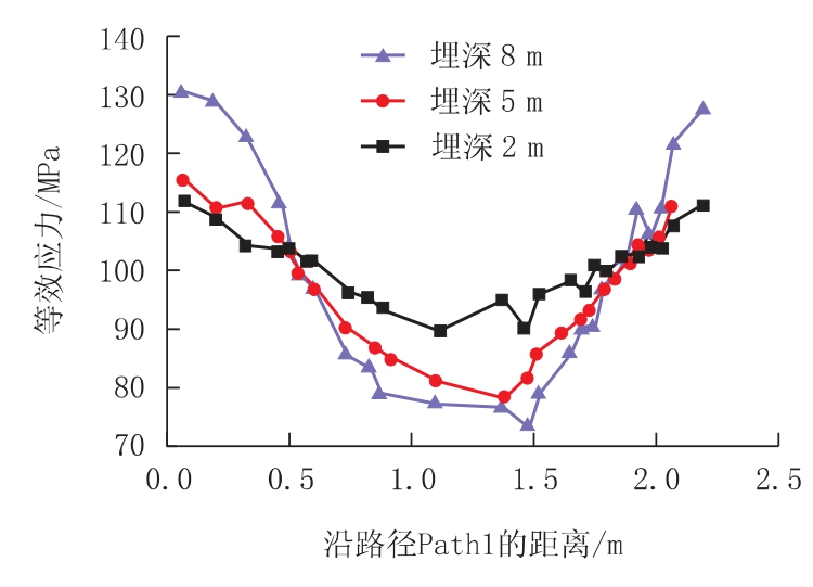 沿著路徑 Path1,埋深為 2 m、 5 m 和 8 m的管體等效應(yīng)力曲線如圖8 所示。 由圖8 可見,路徑Path1 起始端和末端的等效應(yīng)力較大,路徑中間部分應(yīng)力較小,埋深為8 m 的整體應(yīng)力變化幅度較大,最大等效應(yīng)力為 130 MPa,埋深5 m 的管體等效應(yīng)力變化幅度次之,埋深為2 m的管體等效應(yīng)力變化幅度最小。