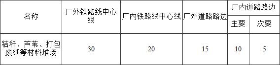 表4.5.3 露天、半露天可燃材料堆場與鐵路、道路的防火間距(m)