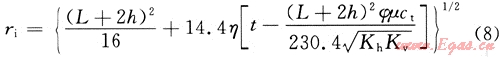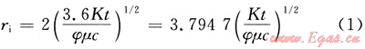 石油工業(yè)中國際上對(duì)于探測半徑的定義為:在某一確定的瞬時(shí),給井中施加一個(gè)壓力脈沖,對(duì)該脈沖響應(yīng)達(dá)到最大值的位置就稱為探測半徑。在標(biāo)準(zhǔn)單位制式下,探測半徑表示為[1]:
