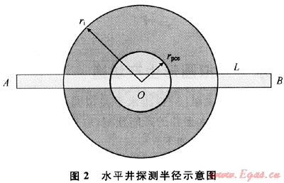 基于以上認(rèn)識(shí)和假設(shè),將水平井的探測半徑定義為:以水平段AB的中點(diǎn)為圓心0,以擬圓形生產(chǎn)坑道外緣半徑為基準(zhǔn),在生產(chǎn)過程壓力脈沖響應(yīng)達(dá)到的最大位置至圓心O的距離(圖2)。