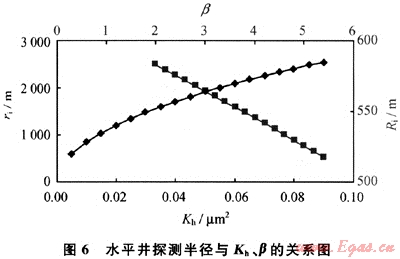 該水平井探測半徑存在一個(gè)基準(zhǔn)值,即水平井測試或生產(chǎn)完成垂直平面內(nèi)的徑向流時(shí)的探測半徑(擬圓形坑道的外緣半徑rpce)以及對(duì)應(yīng)的時(shí)間tpce測試或生產(chǎn)時(shí)間大于tpce時(shí)即可進(jìn)行計(jì)算。對(duì)于油氣藏儲(chǔ)集空間平面上表現(xiàn)出徑向復(fù)合的非均質(zhì)特征時(shí),可以先對(duì)儲(chǔ)層水平滲透率進(jìn)行平均后再進(jìn)行計(jì)算。實(shí)際計(jì)算結(jié)果表明,水平井探測半徑隨測試或生產(chǎn)時(shí)間及儲(chǔ)層滲透率的增大而增大,隨儲(chǔ)層厚度、水平段長度及各向異性系數(shù)的增大而降低。根據(jù)筆者提出的方法,不僅可以實(shí)時(shí)評(píng)價(jià)水平井的探測半徑、對(duì)油氣藏的控制程度,還可優(yōu)化水平井油藏工程設(shè)計(jì)、評(píng)價(jià)水平井開發(fā)的優(yōu)勢。
