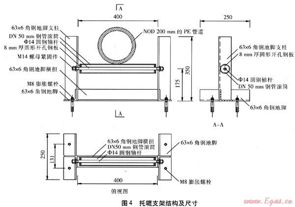 焊接完畢的待穿管PE管道,應(yīng)每隔5m設(shè)1組托輥支架對其進行支撐。穿管作業(yè)時,前行的PE管道帶動滾筒圍繞軸桿轉(zhuǎn)動,接觸面呈滾動摩擦狀態(tài),一方面可防止PE管道被地表硬物劃傷,另一方面可減小穿管時的摩擦阻力,加快穿管作業(yè)進度,使PE管道沿預(yù)設(shè)的線路前進,不致于產(chǎn)生過大的偏移。托輥支架的結(jié)構(gòu)及尺寸見圖4。
