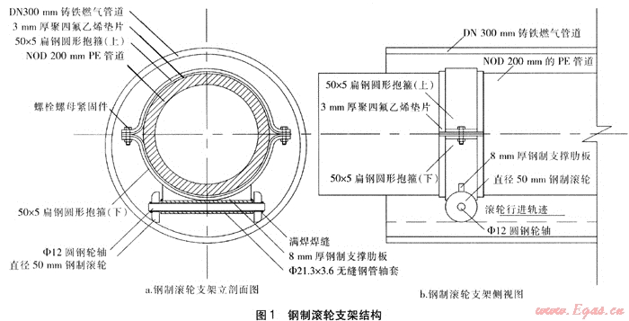 摘要:以某DN 300mm鑄鐵燃氣管道改造工程為例,詳細介紹了以廢舊的DN 300mm鑄鐵燃氣管道為套管,將公稱外徑200mm的PE燃氣管道采用鋼制滾輪支架穿插入套管的施工方法。