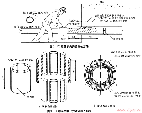 ② 如圖8所示,在NOD 200mm的PE管道上套入一截長度為300mm的NOD 250mm的PE短管(PE80、SDR11),并將其置于套管內(nèi);由于NOD 250mm的PE短管的內(nèi)徑比NOD 200mm的PE燃氣管道的外徑略大,適合用作對NOD 200mm的PE燃氣管道進行限位、支承的承托。NOD 250mm的PE短管外側(cè)與套管端口的水平凈距為200mm,作為柔性防水層封堵的預(yù)留空間。