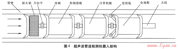 超聲波檢測法是利用超聲波的脈沖反射原理,通過超聲波在介質(zhì)中傳播時遇金屬表面發(fā)生部分反射的特性來測定管道的壁厚及管內(nèi)表面狀況的一種方法。管道內(nèi)檢測使用的超聲波檢測儀為管道內(nèi)通行的檢測機器人,超聲波管道檢測機器人是一種能夠遠程控制、在管道內(nèi)行走、裝載有超聲波傳感器件的機構(gòu)(見圖4)[4]。檢測機器人由液體推動,由多節(jié)功能艙組成。主要包括探頭架、萬向節(jié)、皮碗、控制器艙、計算機艙、里程輪、電池艙、天線等。探頭架內(nèi)安裝有環(huán)向陣列超聲波檢測器,是檢測管道壁厚數(shù)據(jù)的來源;艙與艙之間以萬向節(jié)連接,便于通過管道轉(zhuǎn)彎部分;多個皮碗實現(xiàn)檢測裝置的密封;控制器艙內(nèi)安裝控制整套機構(gòu)動作的執(zhí)行元件;計算機艙負責接收外部指令并向控制器艙發(fā)送動作指令;里程輪用于計算從管道入口開始行走的距離;電池艙給管道內(nèi)整套檢測裝置供電;天線負責檢測機器人與地面控制裝置的通信。