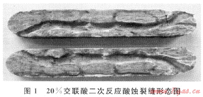 試驗結(jié)果表明,20%膠凝酸鮮酸能得到一定的導(dǎo)流能力,10%膠凝酸(模擬殘酸)導(dǎo)流能力遠遠低于鮮酸,說明酸液進入裂縫的深部刻蝕能力降低,試驗3與試驗1相比,說明閉合酸化能顯著提高裂縫導(dǎo)流能力。二次試驗后平行板巖心的酸蝕溶孔道更為明顯,而且酸蝕孔道的深度更深,具有更高的導(dǎo)流能力(圖1)。說明采用高黏度的交聯(lián)酸,無需進行閉合酸化和多級注入工藝就可以獲得高的導(dǎo)流能力,而且由于酸巖反應(yīng)慢,活性酸能進入地層深部,是進行碳酸鹽巖地層深部改造的理想酸液體系。