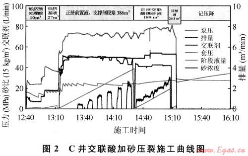 C井的交聯(lián)酸加砂壓裂是國內(nèi)外首次在井深超過5000m、溫度高于140℃地層中成功實現(xiàn)真正的交聯(lián)酸加砂施工,為碳酸鹽巖的儲層改造開拓了新的、更廣闊的途徑,在碳酸鹽巖改造工藝突破的歷史進程中具有里程碑的意義。