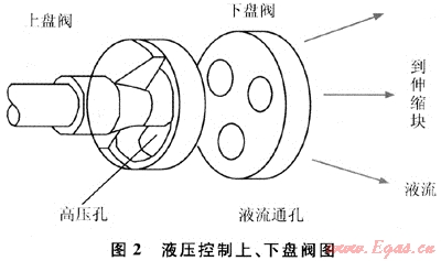 調(diào)制式旋轉(zhuǎn)導(dǎo)向鉆井工具(MRST)屬于推靠式旋轉(zhuǎn)導(dǎo)向鉆井工具(圖1)。由于其鉆柱與井壁之間不存在靜止點,因此,在鉆井過程中更可體現(xiàn)旋轉(zhuǎn)鉆井的優(yōu)越性[1]。調(diào)制式旋轉(zhuǎn)導(dǎo)向鉆井系統(tǒng)導(dǎo)向力的大小和方向主要是由穩(wěn)定平臺控制的。當(dāng)需要最大導(dǎo)向力時,穩(wěn)定平臺控制軸就帶動上盤閥旋轉(zhuǎn),使上盤閥穩(wěn)定在預(yù)定方向,控制上盤閥高壓孔方向恒定。在鉆柱旋轉(zhuǎn)過程中,每個“巴掌”依次在該方向附近伸出拍打井壁,導(dǎo)向機(jī)構(gòu)對井壁的作用力就是這些拍打力的合力。這個合力的反力就是鉆柱受到的導(dǎo)向力,方向沿著上盤閥預(yù)定方向的反方向。當(dāng)不需要導(dǎo)向時,穩(wěn)定平臺帶動上盤閥以和鉆柱具有不同的某一轉(zhuǎn)速勻速轉(zhuǎn)動,這時“巴掌”均勻拍打井壁四周,導(dǎo)向工具可控制的液壓導(dǎo)向力的合力就等于零,此時導(dǎo)向工具呈中性工作狀態(tài),達(dá)到穩(wěn)斜效果。MRST液壓控制閥采用上、下盤閥結(jié)構(gòu),上盤閥與穩(wěn)定平臺控制軸相連接,它只有一個弧形長孔形狀的高壓閥孔。下盤閥與鉆柱本體連接,隨MRST外殼及鉆柱一起旋轉(zhuǎn),它有3個互成120°圓心角的等直徑低壓孔(泄流孔),見圖2。