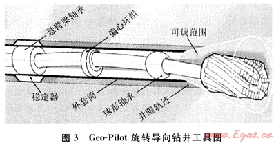 Geo-Pilot[2~3]是一種不旋轉(zhuǎn)套式導(dǎo)向工具(圖3),屬于指向式旋轉(zhuǎn)導(dǎo)向鉆井工具。它不是靠偏心穩(wěn)定器的翼肋推靠井壁偏置鉆頭進(jìn)行導(dǎo)向,而是靠不旋轉(zhuǎn)套與萬向短節(jié)之間的一套偏心機(jī)構(gòu)使萬向軸偏置,從而為鉆頭提供了一個與井眼軸線不一致的傾角,產(chǎn)生導(dǎo)向作用。該機(jī)構(gòu)由幾個可控制的偏心環(huán)組合而成,當(dāng)井下自動控制完成偏心環(huán)組合之后,該機(jī)構(gòu)將相對于不旋轉(zhuǎn)套固定,從而始終將萬向軸向固定方向偏置,為鉆頭提供一個方向固定的傾角。