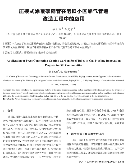 本文介紹了壓接式涂覆碳鋼管材及管件的構(gòu)造、特點及壓接原理,并通過對壓接式涂覆碳鋼管及管件在燃氣管道領(lǐng)域的應用跟蹤,闡述了涂覆碳鋼管在老舊小區(qū)燃氣管道改造工程中的應用前景。