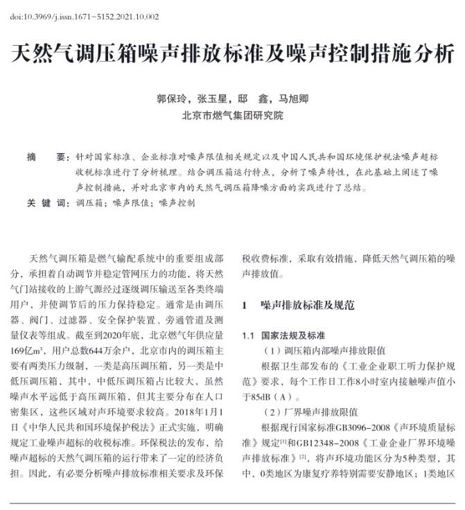 針對(duì)國(guó)家標(biāo)準(zhǔn)、企業(yè)標(biāo)準(zhǔn)對(duì)噪聲限值相關(guān)規(guī)定以及中國(guó)人民共和國(guó)環(huán)境保護(hù)稅法噪聲超標(biāo)收稅標(biāo)準(zhǔn)進(jìn)行了分析梳理。結(jié)合調(diào)壓箱運(yùn)行特點(diǎn),分析了噪聲特性,在此基礎(chǔ)上闡述了噪聲控制措施,并對(duì)北京市內(nèi)的天然氣調(diào)壓箱降噪方面的實(shí)踐進(jìn)行了總結(jié)。