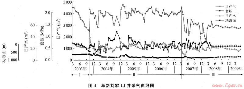 阜新劉家區(qū)塊LJ井2003年投產(chǎn)(圖4),初期日產(chǎn)氣4500m3,穩(wěn)產(chǎn)4a開始遞減,目前日產(chǎn)氣2780m3,已累計(jì)采出662×104m3,采出程度26.6%,預(yù)計(jì)采收率50%。解吸類型劃分為阻礙解吸(高液面)、暢通解吸、低飽和解吸3個(gè)階段。①阻礙型解吸:解吸速率大于降壓速率,氣泡變形,解吸困難;②暢通型解吸:解吸速率接近降壓速率,氣泡帶出部分束縛水,產(chǎn)量理想;③低飽和解吸:解吸速率小于降壓速率,應(yīng)力閉合。從中國(guó)目前煤層氣開采現(xiàn)狀分析,直井第一階段一般小于1a;第二階段井距為300m×300m一般可采4~6a,與井距、煤厚和排采速度等有關(guān);第三階段開采時(shí)間較長(zhǎng),羽狀水平井穩(wěn)產(chǎn)階段更短,為1~3a。