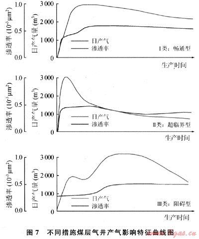暢通型解吸:降壓速率接近解吸速率,日產(chǎn)氣上升-相對(duì)穩(wěn)產(chǎn)-遞減;滲透率隨開采的束縛水、氣產(chǎn)出上升-穩(wěn)定,開采效果最佳(圖7)。