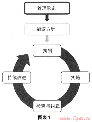 用能企業(yè)是實(shí)現(xiàn)能源節(jié)約的核心。在以節(jié)能減排為重要目標(biāo)的指引下,企業(yè)使用任何能源,都應(yīng)制定一個(gè)基本的控制程序,形成一個(gè)有效能源管理體系運(yùn)行模式。企業(yè)為兌現(xiàn)管理承諾和實(shí)現(xiàn)能源方針應(yīng)進(jìn)行策劃-實(shí)施-檢查與糾正-持續(xù)改進(jìn)(PDCA)等過(guò)程。圖示如下(圖表1):