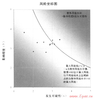 風(fēng)險(xiǎn)坐標(biāo)圖法就是把風(fēng)險(xiǎn)發(fā)生可能性的高低、風(fēng)險(xiǎn)發(fā)生后對(duì)目標(biāo)的影響程度,作為兩個(gè)維度繪制在同一個(gè)平面上(即繪制成直角坐標(biāo)系)。對(duì)風(fēng)險(xiǎn)發(fā)生可能性的高低、風(fēng)險(xiǎn)對(duì)目標(biāo)影響程度的評(píng)估又分為定性、定量等方法。定性方法相對(duì)比較簡(jiǎn)單,可以直接運(yùn)用定性術(shù)語描述發(fā)生的可能性的高低以及對(duì)目標(biāo)影響程度。如“極低”、“低”、“中等”、“高”、“極高”等。定量方法是對(duì)風(fēng)險(xiǎn)發(fā)生可能性的高低、風(fēng)險(xiǎn)對(duì)目標(biāo)影響程度用具有實(shí)際意義的數(shù)量描述,如對(duì)風(fēng)險(xiǎn)發(fā)生可能性的高低用概率來表示,對(duì)目標(biāo)影響程度用損失金額來表示。深圳燃?xì)獠扇〉亩亢投ㄐ韵嘟Y(jié)合的坐標(biāo)圖法評(píng)估出的重大風(fēng)險(xiǎn)。
