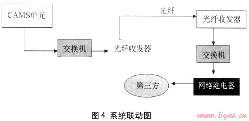 利用鋪設(shè)的備用光纖組建局域網(wǎng),通過交換機把5臺控制器接入,同時也將設(shè)置在“主調(diào)中心”內(nèi)部監(jiān)控中心的“CAMS單元”通過交換機接入整體系統(tǒng)來實現(xiàn)對前端5臺控制器的集中管理,利用CAMS單元的電子地圖功能來對防護目標(biāo)進行實時監(jiān)控。“光纖收發(fā)器”和“網(wǎng)絡(luò)繼電器”以及“CAMS單元”來實現(xiàn)前端管道現(xiàn)場其它設(shè)備的聯(lián)動(圖4)。