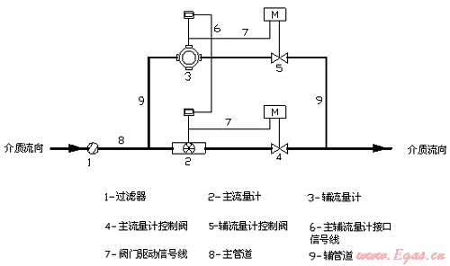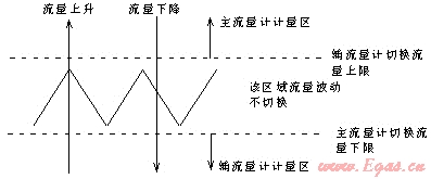 組合式流量計將工作流量分為大小兩段計量,根據(jù)所有燃燒設(shè)備的最大用氣量Qmax選定主流量計,根據(jù)單一燃燒設(shè)備的最小用氣量Qmin值與0.2Qmax值選定輔助流量計,并使主輔流量計量程部分覆蓋,通過流量控制閥組合在一起,使流量計能測量波動范圍較大的流量,其示意圖如下所示: