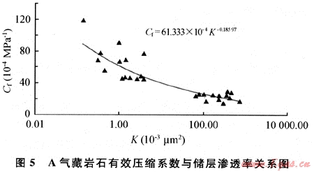 實(shí)驗(yàn)分析表明,對(duì)于同一個(gè)氣藏,Cf值與其他物性參數(shù)一樣,也同樣具有非均質(zhì)性。圖5為A氣藏巖心分析結(jié)果,從中可以看出,Cf與儲(chǔ)層滲透率有關(guān),高滲儲(chǔ)層Cf值低,低滲儲(chǔ)層Cf值高,對(duì)于該氣田不同滲透率巖樣,Cf的變化范圍為2×10-3~10×10-3MPa-1。針對(duì)不同的Cf值,動(dòng)態(tài)儲(chǔ)量計(jì)算結(jié)果也不同,Cf值越大,動(dòng)態(tài)儲(chǔ)量計(jì)算結(jié)果越??;Cf值越小,動(dòng)態(tài)儲(chǔ)量計(jì)算結(jié)果越大。