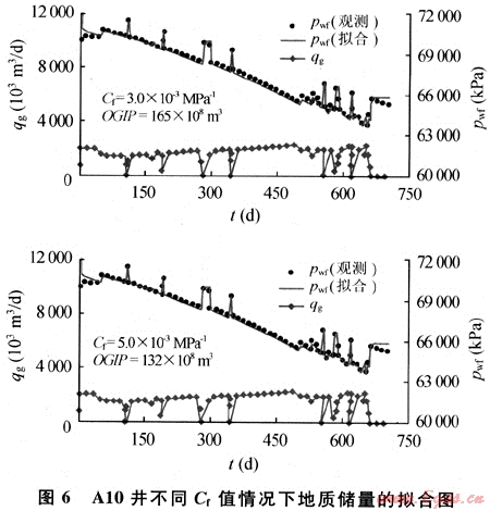 在數(shù)值模擬中,巖石壓縮系數(shù)作為已知參數(shù)輸入到模型中,其取值會(huì)給歷史擬合過(guò)程中儲(chǔ)量的擬合帶來(lái)影響,在其他參數(shù)相向、流壓和關(guān)井壓力完全擬合的情況下,不同的Cf值對(duì)應(yīng)不同擬合儲(chǔ)量(見圖6),從另一個(gè)角度來(lái)看,對(duì)于一個(gè)未投入開發(fā)異常高壓氣藏,以容積法儲(chǔ)量為基礎(chǔ)進(jìn)行生產(chǎn)動(dòng)態(tài)預(yù)測(cè)時(shí),不同的Cf值會(huì)得到不同的早期壓力變化趨勢(shì)。由此可見,對(duì)于異常高壓氣藏,獲得可靠的巖石壓縮系數(shù)值對(duì)早期動(dòng)態(tài)儲(chǔ)量計(jì)算和生產(chǎn)特征認(rèn)識(shí)非常重要。