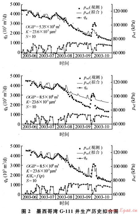 近期出現(xiàn)的“氣井生產(chǎn)動(dòng)態(tài)曲線特征圖版擬合法”可以在不需要關(guān)井測(cè)壓的情況下計(jì)算氣井動(dòng)態(tài)儲(chǔ)量,為復(fù)雜類型氣藏動(dòng)態(tài)分析提供了有效手段,該方法的應(yīng)用也逐漸受到技術(shù)人員的關(guān)注。值得強(qiáng)調(diào)的是,通過(guò)關(guān)井進(jìn)行靜壓監(jiān)測(cè)是不可替代的。下面列舉墨西哥灣-氣井(G-111井,原始地層壓力122.7MPa,儲(chǔ)層溫度177℃)的實(shí)例來(lái)說(shuō)明靜壓資料獲取對(duì)動(dòng)態(tài)儲(chǔ)量計(jì)算的重要性。利用“氣井生產(chǎn)動(dòng)態(tài)曲線特征圖版擬合法”中的“流動(dòng)物質(zhì)平衡”計(jì)算井控儲(chǔ)量5.35×108m3(圖1)。根據(jù)這一儲(chǔ)量計(jì)算結(jié)果,建立單井模型擬合生產(chǎn)歷史,井底流壓擬合程度高(圖2),如果沒有關(guān)井壓力作參照,可以認(rèn)為流動(dòng)物質(zhì)平衡計(jì)算的井控儲(chǔ)量是可靠的。但如果參照關(guān)井壓力數(shù)據(jù),就會(huì)發(fā)現(xiàn)模型計(jì)值靜壓值偏低,說(shuō)明井控儲(chǔ)量計(jì)算存在誤差,根據(jù)這一情況,對(duì)模型中井控儲(chǔ)量進(jìn)行了調(diào)整,并考慮了滲透率的應(yīng)力敏感性,完全擬合后,得到井控儲(chǔ)量為8.5×108m3。由此可見靜壓數(shù)據(jù)的獲取對(duì)動(dòng)態(tài)儲(chǔ)量計(jì)算的重要性。